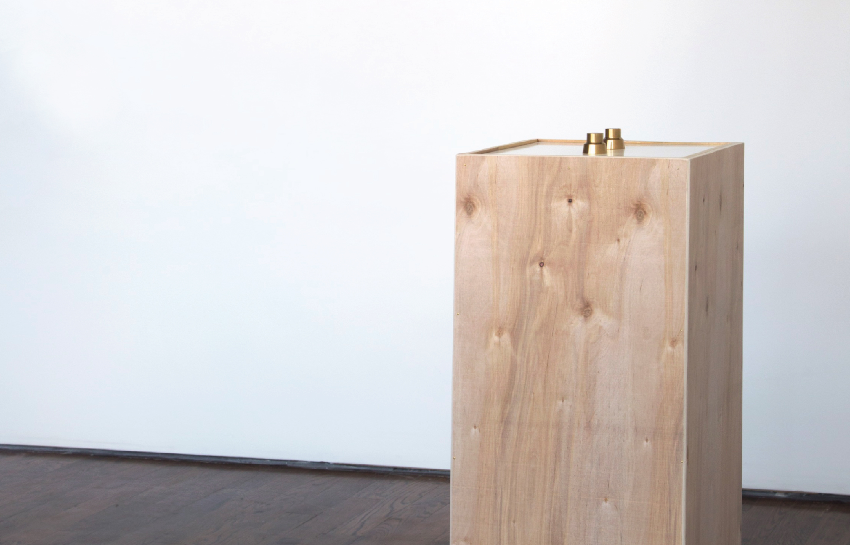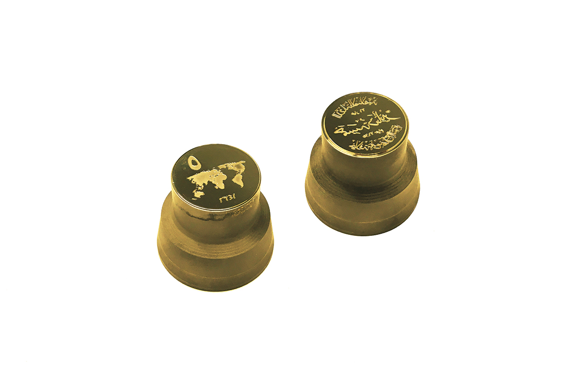 , gold dies of a five Dinar coin, as released in the Islamic State currency proposal on November 13th, 2014, claiming the return of the gold standard as a monetary system, 1 3/4 x 1 1/2 x 1 1/2” / 4 x 3 x 3 cm, 2016